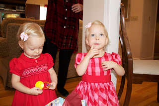 Our girls are still only saying a few words, most of which begin with D or B. Some of their favorites are dog, duck, Daddy, diaper, ball, beep, baby, up, apple, open (which sounds like apple), and water (which sounds like wow). They even learned the name Donald when our friends Donald and Amanda came to visit. Of course! It starts with a D! They have just recently (in the past week) started saying Mama with its true meaning. Needless to say, I am extremely elated with this new development!
